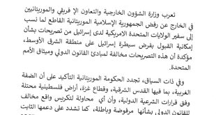 بيان تتابع وزارة الشؤون الخارجية والتعاون الإفريقي والموريتانيين في الخارج بالجمهورية الإسلامية الموريتانية بقلق بالغ التطورات العسكرية المتسارعة في الشرق الأوسط إثر الهجمات الأمريكية–الإسرائيلية على الجمهورية الإسلامية الإيرانية. وتعرب في هذا الصدد، عن إدانتها الشديدة للاعتداءات الإيرانية على الدول العربية الشقيقة: المملكة العربية السعودية، ودولة الإمارات العربية المتحدة، ودولة الكويت، ودولة قطر، ومملكة البحرين، والمملكة الأردنية الهاشمية. وتؤكد تضامن الجمهورية …