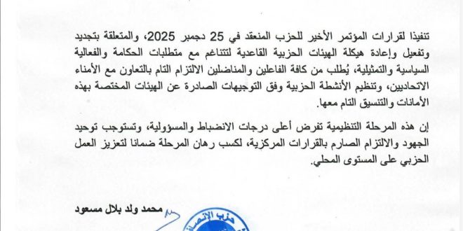 تنفيذًا لقرارات المؤتمر الأخير للحزب المنعقد في 25 دجمبر 2025، والمتعلقة بتجديد وتفعيل وإعادة هيكلة الهيئات الحزبية القاعدية لتتناغم مع متطلبات الحكامة والفعالية السياسية والتمثيلية، يُطلب من كافة الفاعلين والمناضلين الالتزام التام بالتعاون مع الأمناء الاتحاديين، وتنظيم الأنشطة الحزبية وفق التوجيهات الصادرة عن الهيئات المختصة بهذه الأمانات والتنسيق التام معها.