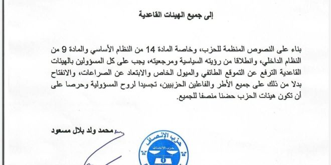 بناء على النصوص المنظمة للحزب، وخاصة المادة 14 من النظام الأساسي والمادة 9 من النظام الداخلي، وانطلاقا من رؤيته السياسية ومرجعيته، يجب على كل المسؤولين بالهيئات القاعدية الترفع عن التموقع الطائفي والميول الخاص والابتعاد عن الصراعات، والانفتاح بدلا من ذلك على جميع الأطر والفاعلين الحزبيين، تجسيدا لروح المسؤولية وحرصا على أن تكون هيئات الحزب حضنا منصفا للجميع.