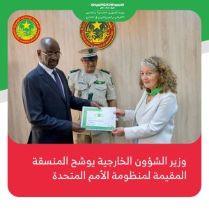 وشح معالي وزير الشؤون الخارجية والتعاون الإفريقي والموريتانيين في الخارج، السيد محمد سالم ولد مرزوك، باسم فخامة رئيس الجمهورية السيد محمد ولد الشيخ الغزواني، يوم أمس الجمعة بقاعة الاجتماعات بالوزارة، المنسقة المقيمة لمنظومة الأمم المتحدة في موريتانيا، سعادة السيدة ليلا بيترس يحيى، بوسام كوماندور من نظام الاستحقاق الوطني الموريتاني، وذلك بمناسبة انتهاء مأموريتها في بلادنا.