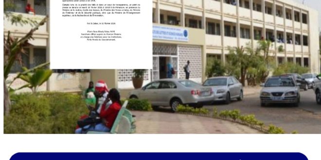 وأعلنت أنه نظراً لخطورة الوضع والحرص على الشفافية، سيعقد مؤتمر صحفي اليوم الثلاثاء (10 فبراير 2026 في الساعة الرابعة مساءً في الوزارة الأولى بحضور وزير العدل، وحافظ الأختام، ووزير القوات المسلحة، ووزير الداخلية والأمن العام، بالإضافة إلى وزير التعليم العالي والبحث والابتكار، لتسليط الضوء على تطورات المظاهرات الطلابية في جامعة شيخ أنت جوب، وأسبابها.