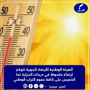 توقعت الهيئة الوطنية للأرصاد الجوية تسجيل ارتفاع ملحوظ في درجات الحرارة يوم غد الخميس على عموم التراب الوطني.