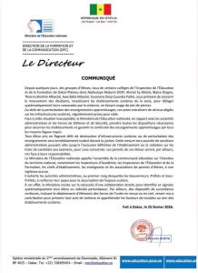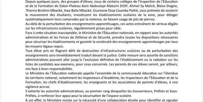 أعلنت وزارة التربية الوطنية في بلاغ لها اليوم الأربعاء 25 فبراير الجاري أنه لوحظ في الأيام الأخيرة استهداف مجموعات طلابية مدارس كثيرة في مفتشية دكار بلاتو لإخراج التلاميذ بالقوة باستخدام الحجارة إلى جانب تعطيل حركة التعليم بذريعة دعم الحركات الطلابية في الجامعة، وتلحق هذه الظاهرة أضرارا جسيمة على البنى التحتية للمدارس.