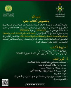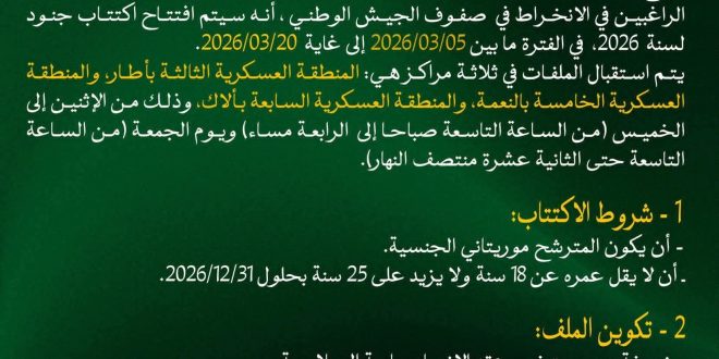 ترفع الأركان العامة للجيوش / فرقة المصادر البشرية، إلى علم الشباب الموريتانيين الراغبين في الانخراط في صفوف الجيش الوطني ، أنه سيتم افتتاح اكتتاب جنود 2026/03/20 لسنة 2026، في الفترة ما بين 2026/03/05 إلى غاية