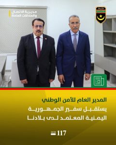 التقى السيد المدير العام للأمن الوطني الفريق محمد لحريطاني صباح اليوم الأربعاء 18 مارس 2026 بسعادة السفير سالم صالح العرادة، سفير الجمهورية اليمنية المعتمد لدى بلادنا وذلك في إطار تعزيز علاقات التعاون الثنائي بين البلدين الشقيقين.