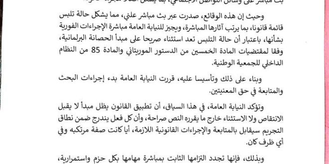 حاً على مبدأ الحصانة البرلمانية، وفقاً لمقتضيات المادة الخمسين من الدستور الموريتاني والمادة 85 من النظام الداخلي للجمعية الوطنية.