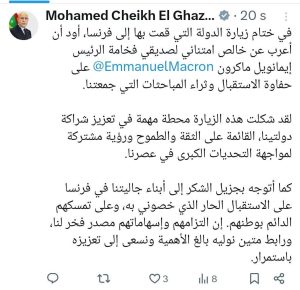 ”في ختام زيارة الدولة التي قمت بها إلى فرنسا، أود أن أعرب عن خالص امتناني لصديقي فخامة الرئيس إيمانويل ماكرون @EmmanuelMacron على حفاوة الاستقبال وثراء المباحثات التي جمعتنا.