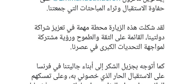 كما أتوجه بجزيل الشكر إلى أبناء جاليتنا في فرنسا على الاستقبال الحار الذي خصوني به، وعلى تمسكهم الدائم بوطنهم. إن التزامهم وإسهاماتهم مصدر فخر لنا، ورابط متين نوليه بالغ الأهمية ونسعى إلى تعزيزه باستمرار.”