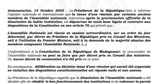 بيان جديد من رئيس مدغشقر: . عَقْد اجتماع من طرف بعض الأعضاء السابقين بالجمعية الوطنية، بعد الإعلان الرسمي عن حلّ هذه المؤسسة، لا يستند إلى أي أساس قانوني، ويُعد مخالفا لأحكام الدستور، ولا سيما المادة 76. . بناء على دستور جمهورية مدغشقر، فإن دعوة الجمعية الوطنية للانعقاد لا يمكن أن تتم إلا بمرسوم يصدر عن مجلس الوزراء. . أي مداولات …